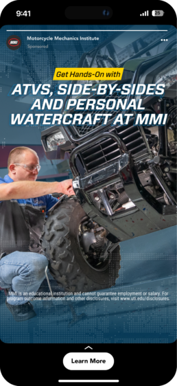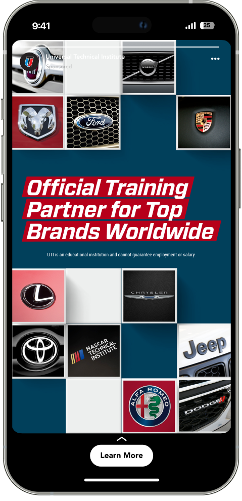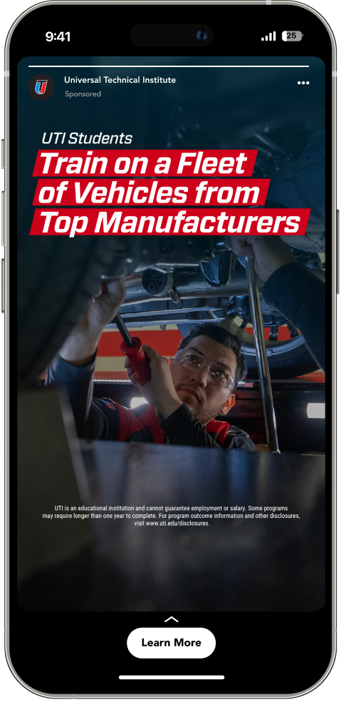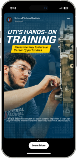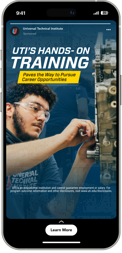 For Universal Technical Institute, I developed paid media creative aimed at capturing attention and driving enrollment across digital channels. The challenge was breaking through a crowded education landscape, where prospective students are constantly exposed to messaging from competing programs. The campaign needed to clearly communicate UTI’s hands-on training, industry certifications, and career-focused outcomes, while inspiring real action from potential students.